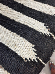Bring a bold visual statement into your home with this Black & Off-White Hemp Jute Runner Rug — a striking handwoven piece that blends natural texture with clean, modern pattern work. Designed with alternating black and off-white stripes, this runner adds rhythm, balance, and contemporary charm to any space while maintaining the warmth of traditional handloom craftsmanship.