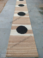 Enhance your home with the elegant simplicity of our Natural White and Black Circle Hemp Jute Runner Rug, a handwoven creation that seamlessly combines traditional weaving artistry with contemporary design. Crafted by skilled Indian artisans, this rug is made from 100% natural hemp and jute fibers, offering a soft yet durable texture that is both eco-friendly and stylish. The striking black circular motifs on a crisp white background add visual interest while maintaining a neutral palette that complements any interior.
