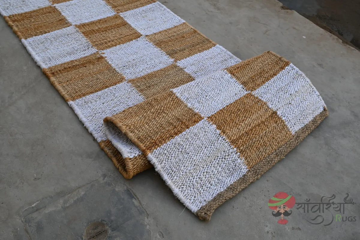 This Handwoven Jute Runner Rug features a clean white checkered pattern on natural jute fibers, perfect for hallways, entryways, kitchens, and staircases. Its farmhouse boho aesthetic adds a touch of rustic elegance while maintaining a modern minimalist look.