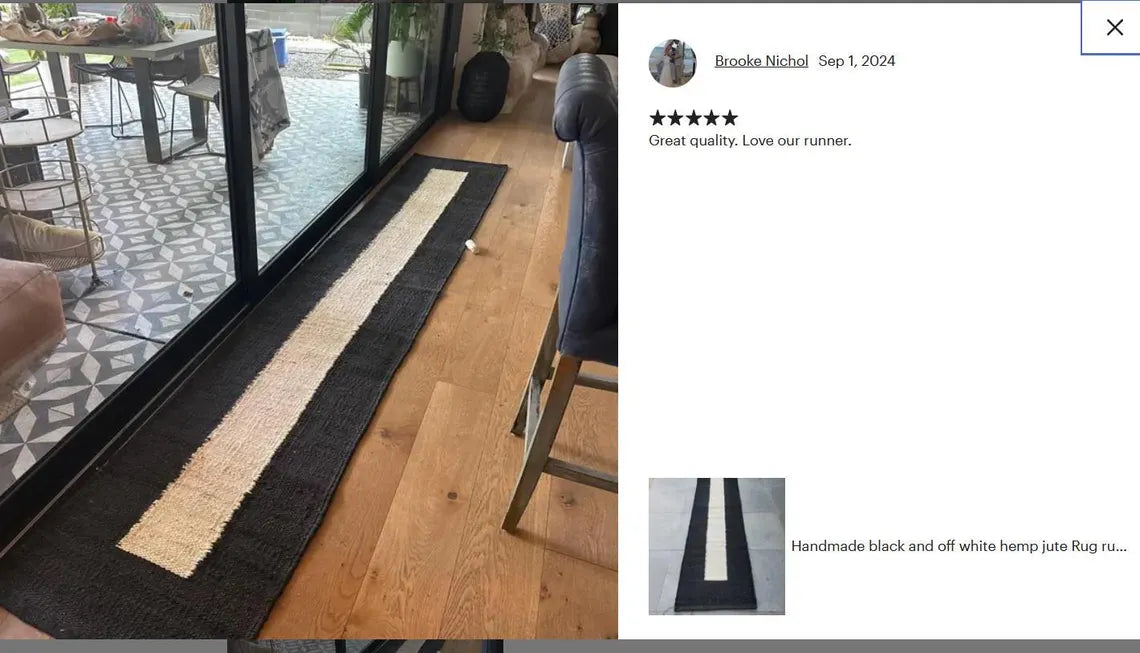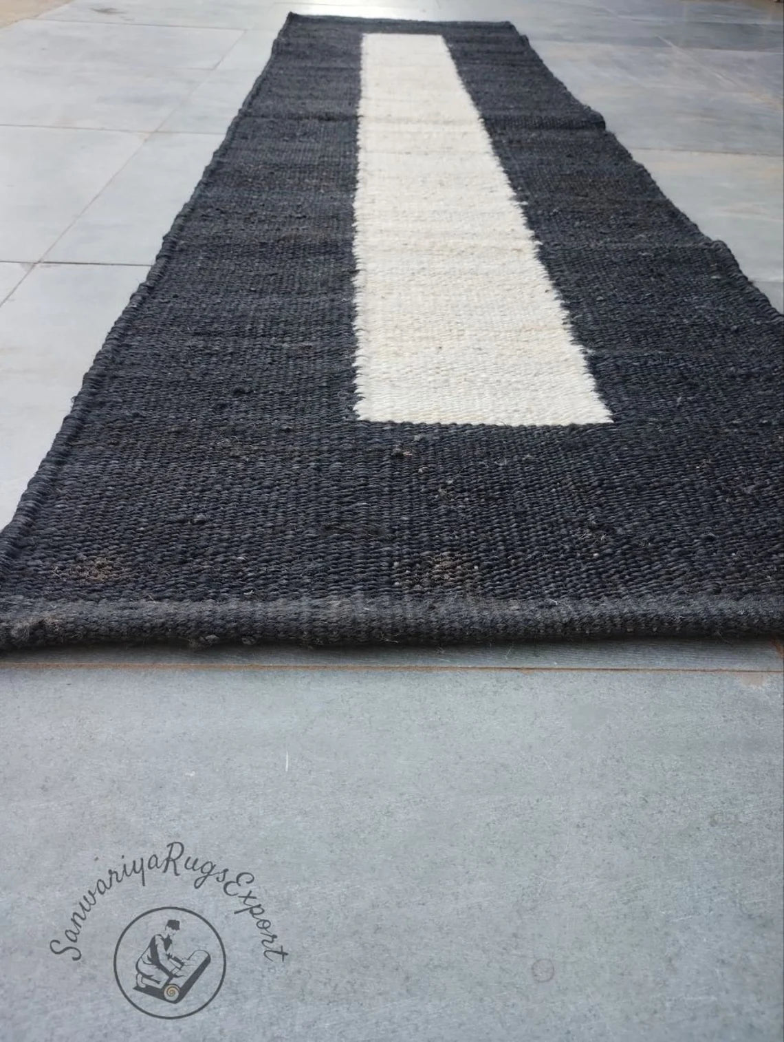 Handwoven Hemp Jute Runner with Black & Off-White Geometric Stripe Pattern