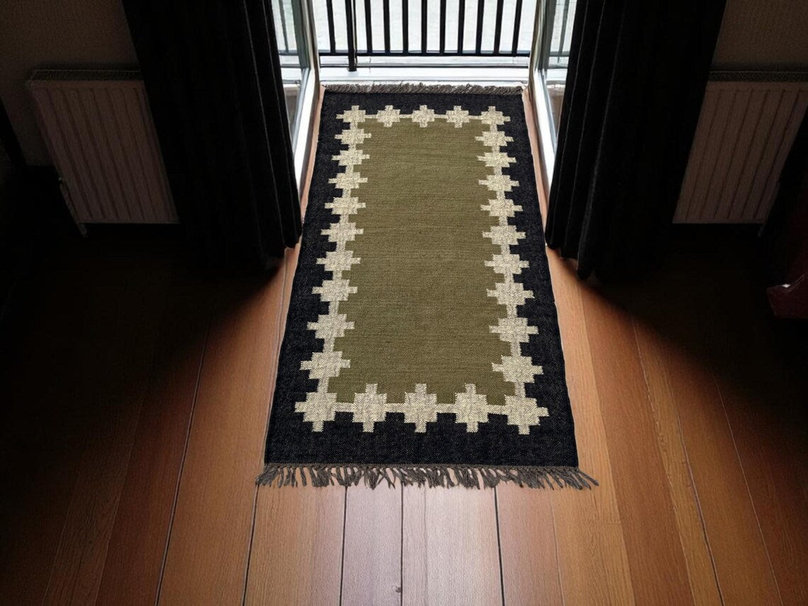 Kilim Rug Runner Green Black Wool & Jute Dhurrie Rug Oriental Geometric Traditional