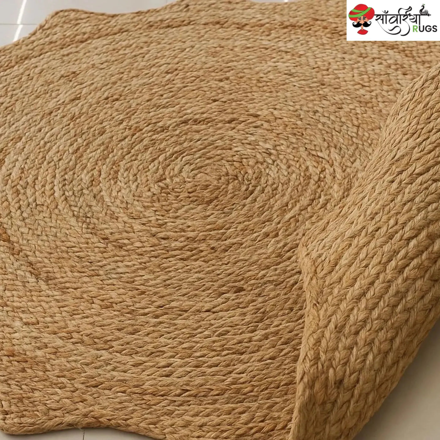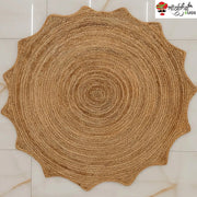 This handwoven jute rug features a sunburst pattern with scalloped edges, creating a stylish focal point that complements bohemian, modern, and minimalist interiors.
