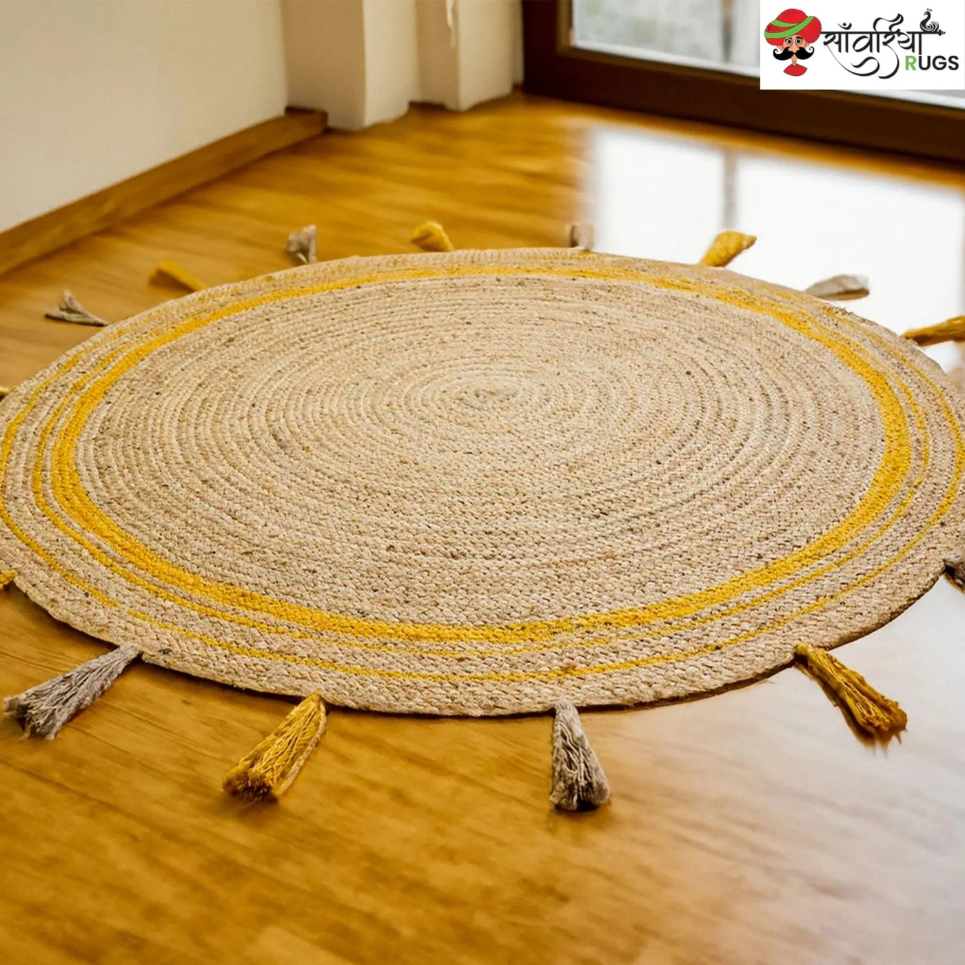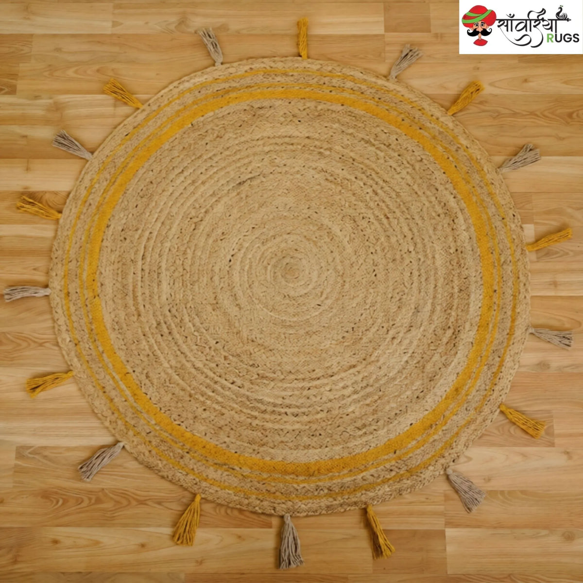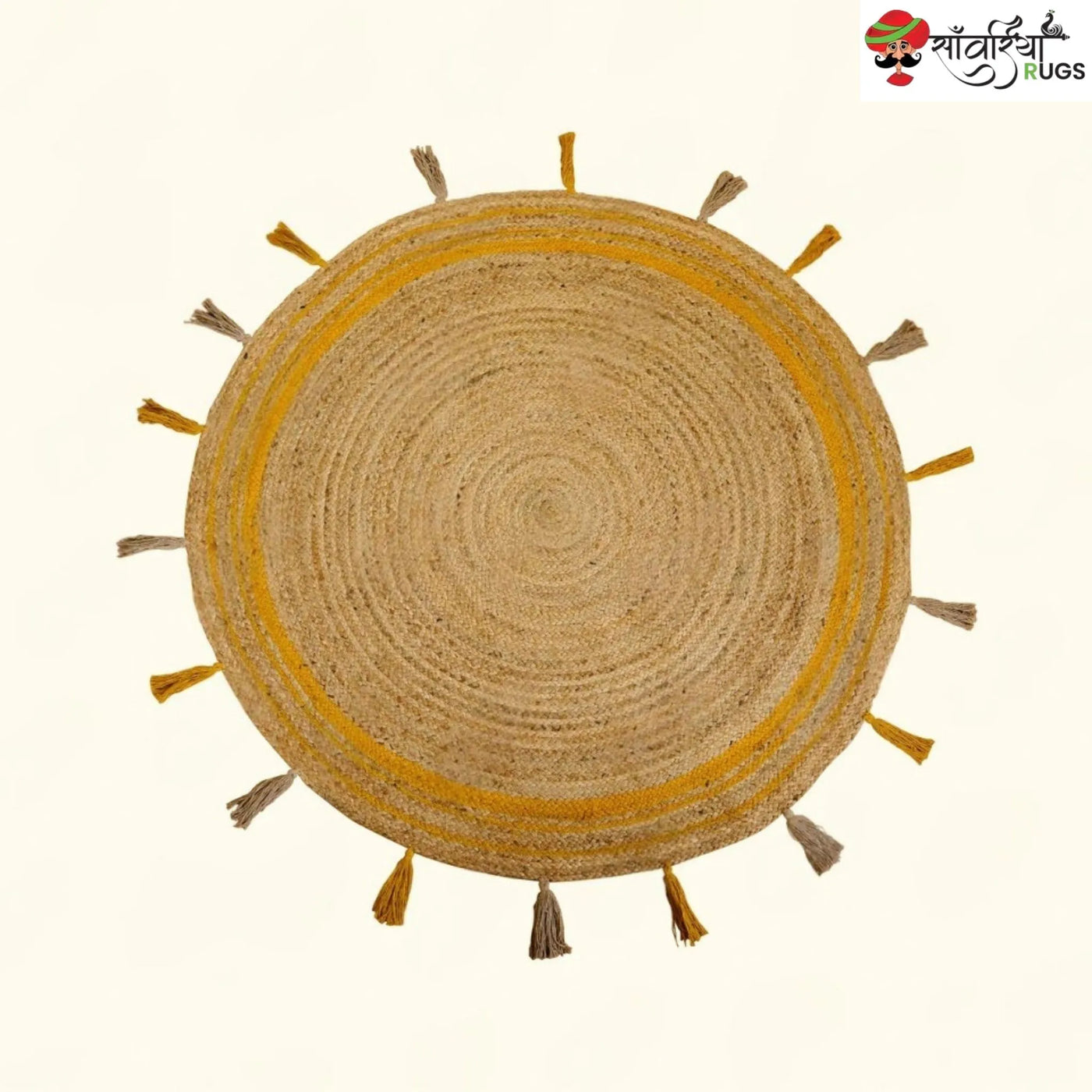 Yellow Braided Jute Round Rug with Tassel Details - 2 x 2 Feet Round Jute Rug